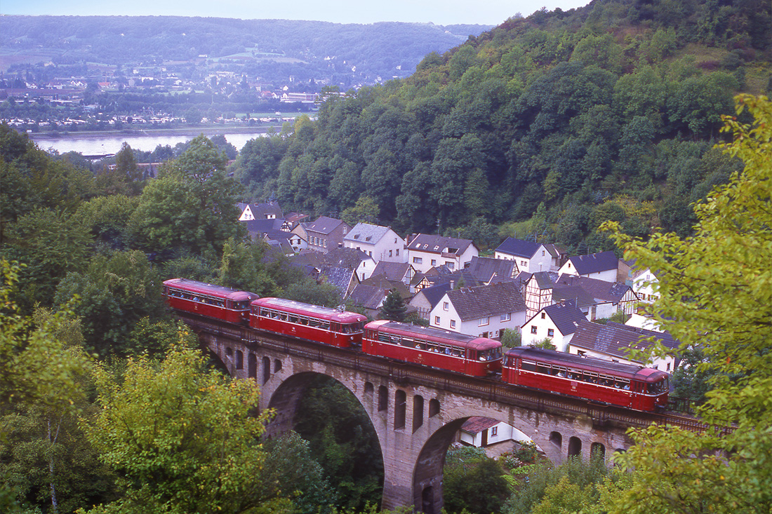 Im historischen Schienenbus geht es auf einer der steilsten Strecken Deutschlands und über ein spektakuläres Viadukt von Linz über Kasbach bis nach Kalenborn. Die Route ist der ideale Startpunkt für Wanderungen ins Kasbachtal oder als Zubringer zum Rheinsteig.
